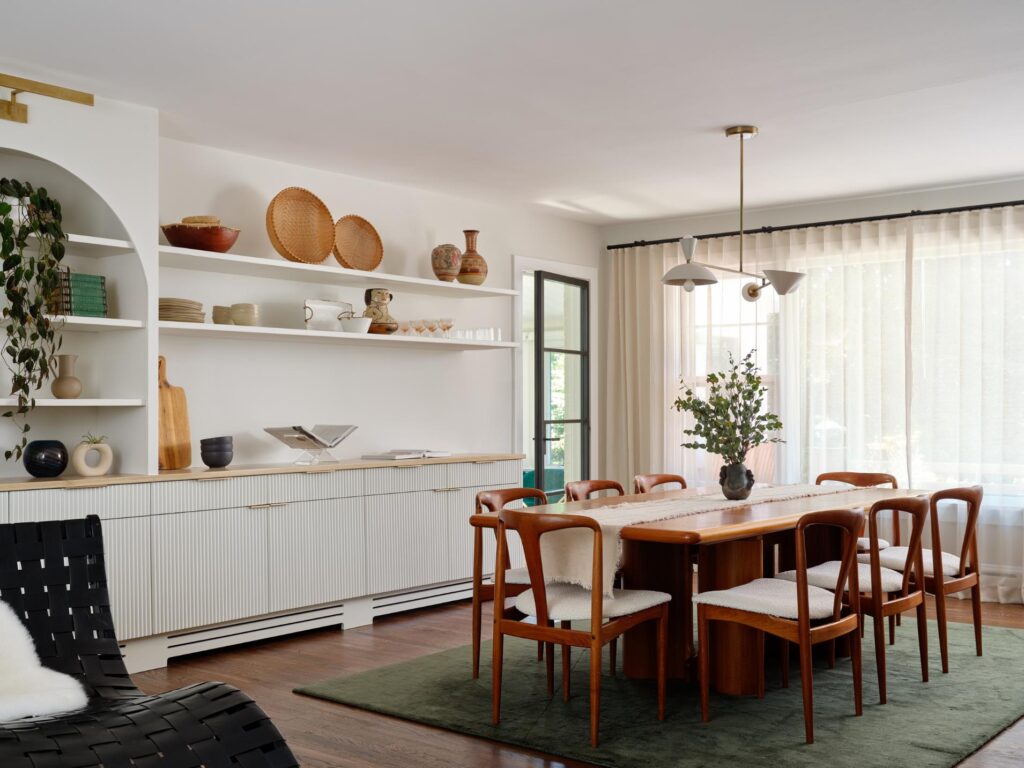 The living room, dining room and kitchen are open to each other, so it was critical that the rest of the main floor be considered together. To make sense of a long wall with an off-centered fireplace and better define each section of the open space, Courtney had arched built-ins installed on either side of the fireplace juxtaposed with floating shelves above a built-in buffet. While the fireplace provides a focal point for the living room area, the buffet defines the dining area. A slouchy off-white couch from their apartmentโthe clientsโ only must-keepโwas reupholstered to find new life in their living room. Courtney defined the living room with a well-worn antique Persian rug, and pulled from its colors to select the dining room rug: a simple solid green. An oil painting by Tyler Hayes, who is known for setting his work on puzzle pieces, adorns the wall over the black marble fireplace surround. โBecause itโs set on puzzle pieces it has that texture thatโs sort of imperfect because some of the pieces are set higher than others,โ says Courtney. The sofa is paired with a white resin Roly Poly chair and a woven leather lounger. A vintage rattan table lamp with a pleated shade brightens the space.