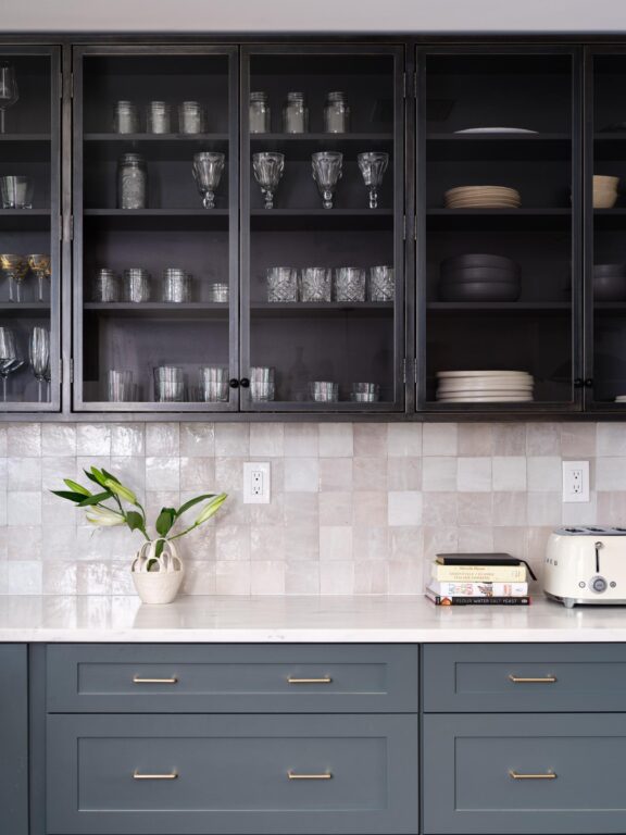 In the kitchen, deep gray cabinets and gold hardware are transitional and timeless, paired with a hand-glazed chiseled terra cotta tile. โThey all have different thicknesses, and some are more proud than others,โ says Courtney. โThereโs nothing that compares to those, and they are very wabi sabi.โ Because the kitchen was small, she tiled the range hood, so it blends seamlessly with the backsplash.