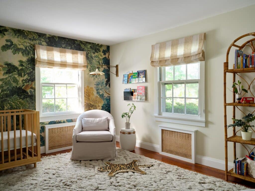 Nature defines the childrenโs rooms as well. Nubby textured rugs, nature-inspired details like animal prints and natural fibers, and mid-century modern furniture celebrate the wabi sabi spirit. Custom natural rattan radiator covers are not only beautiful but also keep the children from touching a hot radiator. Striped Roman shades are a simple solution to window coverings in a linen fabric. A botanical wallpaper in the nursery is from Anthropologie.