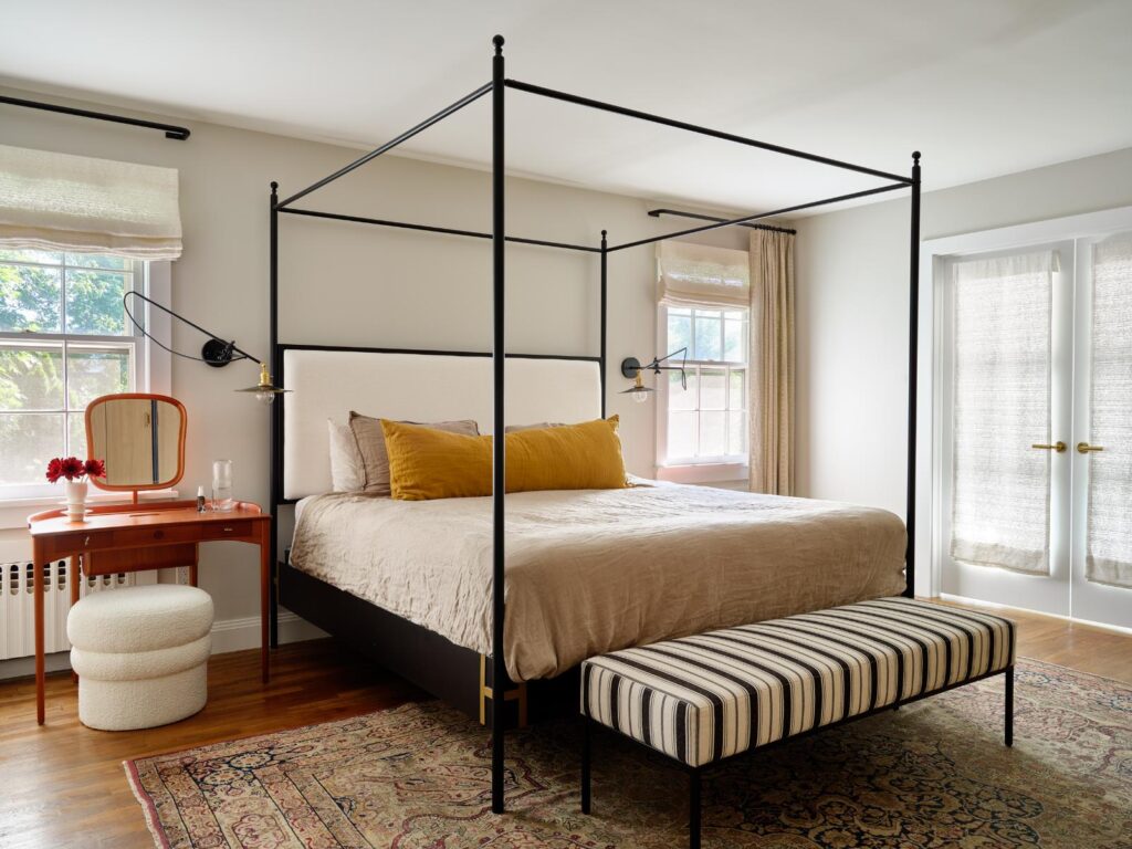 While the childrenโs rooms have a bit of whimsy, the primary suite is all about serenity. Clean lines of an iron canopy bed and striped upholstered bench are paired with the vintage charm of a well-worn rug and second-hand vanity that works as a nightstand, too. Industrial sconces and slubby linen bedding are stylishly imperfect.