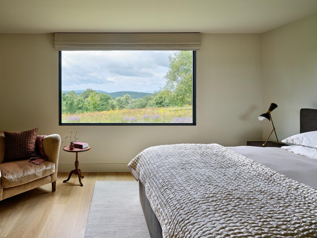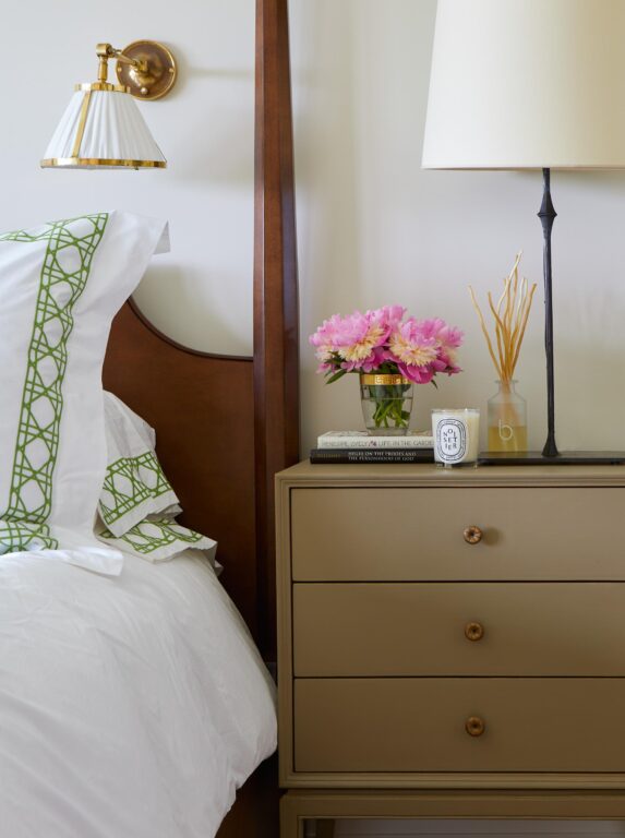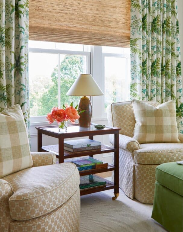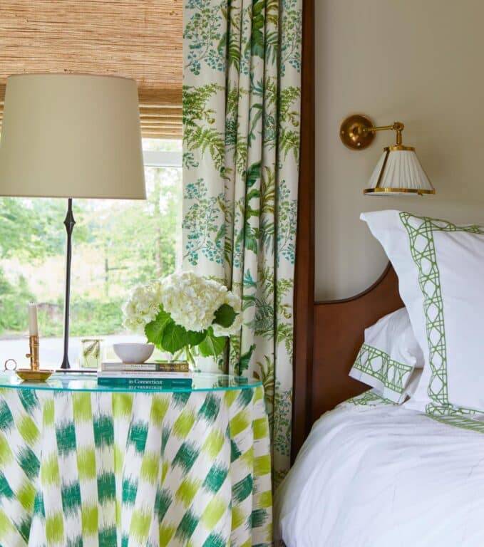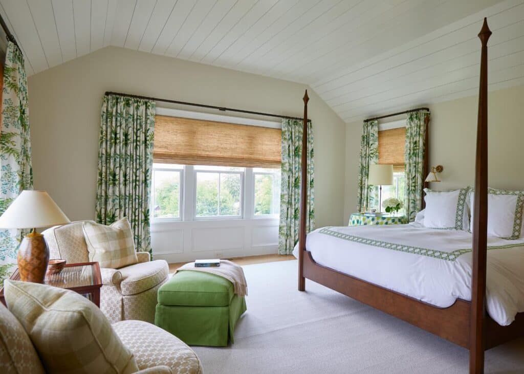 Designer Claudia Kalur at CFK Interiors based in Washington, CT, couldnโ€™t help but use the tree- and fern-filled property of her Litchfield Hills, CT, clients as the inspiration for the serene bedroom she designed for them as part of a new build with architect David Hottenroth. The house was framed over the winter, so when spring came and Kalur began having on-site meetings in spring when everything became lush and green, the objective became clear. โ€œConnecticut winters can be long, so the goal was to bring the outdoors in and prolong the spring and summer seasons,โ€ says Kalur. Blues and greens accent a palette of neutrals, creating โ€œa sense of belonging and calm.โ€ A classic four-poster bed is the leading element, set off by crisp white linens with green embroidery and framed by brass sconces. โ€œOnce we had decided on the design direction (both bring in the outdoors and the color green), finding the right fabric was key,โ€ says Kalur. She chose a fern-filled Colefax & Fowler fabric for the drapes and a colorful Quadrille table skirt with blues and green brush strokes, but kept rest calmer and about texture, in keeping with biophilic theme. โ€œThis is seen in the textured green linen ottoman, the tone-on-tone cream chenille of the chairs, the wool sisal rug from Merida, the vintage clay lamp and the woven bamboo shades,โ€ adds Kalur.