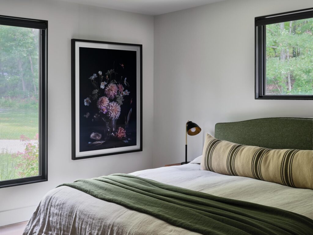 In the bedrooms, less is more. She kept interiors simple with natural and textured linens on the beds, and upholstered headboardsโ€” Jenni Kayne in the primary and Interior Define in the guest room. Modest furnishings and simple locally sourced vintage task lamps donโ€™t distract from the views outside each roomโ€™s window. โ€œI think a very green exterior can completely change the color of a room,โ€ says Cline. โ€œIt bounces the light differently.โ€ When you design with the environment in mind, she says, choosing natural materials and earth-inspired colors is essential to a biophilic design approach. โ€œI think when youโ€™re renovating a house to the studs all the way, but youโ€™re in nature, those imperfect things help you make it feel much more natural and lived in versus feeling pristine and brand new,โ€ she adds.