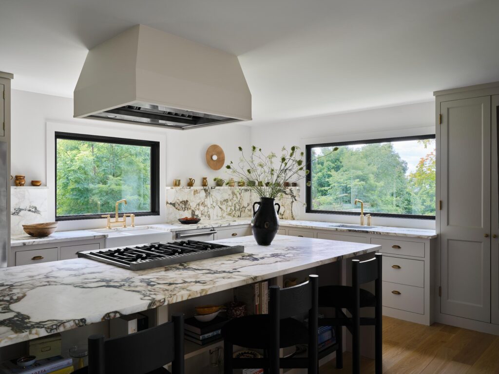 She chose a mix of vintage and new pieces that were rich in texture and light on color. The dining room table, from Fern in Hudson, NY, is a rich wood with classic lines. She reupholstered the coupleโ€™s campy Wes Anderson-style armchair in Zak and Fox fabric and chose a furry shearling vintage chair from 1st Dibs for sitting by the window and taking in the sunsets.  The kitchen cabinets stayed where they were, but Cline had them refinished and topped them, and the existing oversized island, with a striking natural stone with brown, gold and gray veining throughout. Then she matched the slab backsplash in the same marble. โ€œThe kitchen had black cabinets and white tile before, but we wanted it to feel calm, earthy and neutral,โ€ says Cline. โ€œThe marble really matched up so nicely with this magnificent handmade pottery collection from her mother-in-law.โ€
