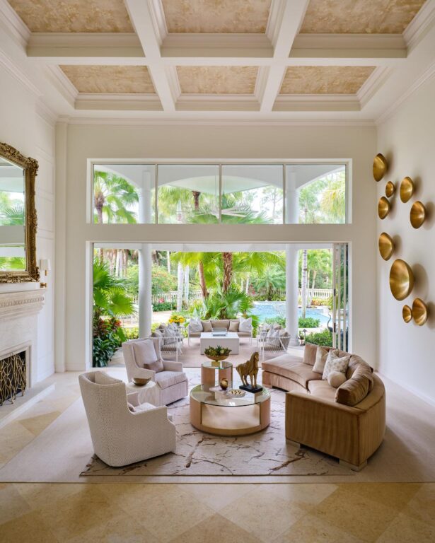 When Interior Designer Shannon Murrayโ€™s clients called her to design their new vacation home in Naples, FL, she knew right away the grand lanai off the living room would be the star of the show. โ€œThe outdoor space drew them to this home and was the jumping off point of the design,โ€ says Murray. Inside, she gave the living room a minimalist and neutral look, so your eye is immediately drawn outdoors. โ€œThese clients are snowbirds from upstate New York so the outdoors and the โ€˜Florida feelโ€™ was important.โ€ She chose a soft rounded sofa to play off the rich beige walls and ceiling, and the grand stone fireplace. The mirror was left by the previous owners, and her clients wanted it to stay, so she balanced it with organically scattered gold bowls on the opposite wall. The golds and beiges โ€œwork alongside the greens of the lanai,โ€ says Murray, who was sure to choose Sunbrella and performance fabrics on the furniture, even indoors. โ€œBeing in Florida, we knew the sliding glass doors would be open to this room most of the time,โ€ she adds. Her advice to others who want to try a biophilic approach: โ€œLook out your window. What do you see that you want to pull indoors? Is it a color, a texture, a feeling? This helps a home to flow and feel connected to its surroundings.โ€