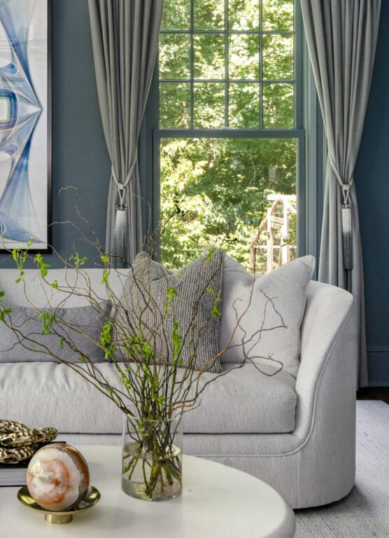 For the formal living room, she chose light colored sofas and a coffee table with rounded edges so the dogs wouldnโt hurt themselves bumping into it. She typically chooses low decorative objects like a coffee table book or flat sculpture so they are less likely to get knocked down. She is always mindful to stay away from poisonous plants and ensure planters do not have exposed dirt that dogs or cats can dig in. In this case, for the larger fig plant in the corner, a grill fits in the base around the plant to cover the dirt. Even with a gas fireplace, Sinkin likes to select fireplace tools to look authentic but when her clients have pets, she opts out. She also ties back curtains and stays away from fringe tassels on curtains and furniture. For this client, she found an elegant lucite tie back to keep curtains contained and neat. The Mongolian fur chairs have real fur, which she says fluffs and cleans better than faux fur, which tends to get matted down when you have pets. โNothing should be too precious that your pets and your family canโt live in the space,โ reasons Sinkin.