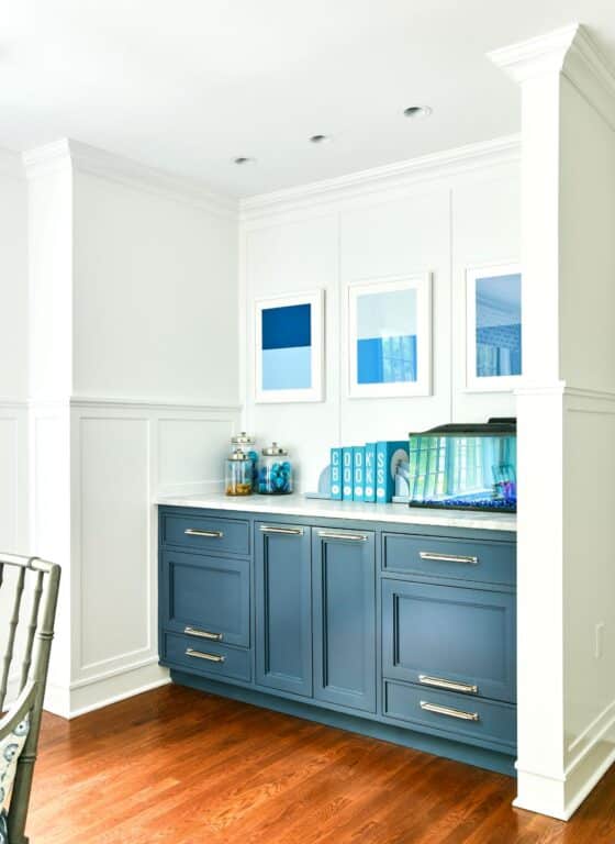 For her clientsโ reading nook, Milhousen took inspiration from the homeโs original trims and baseboards and designed details to match what was existing in the historical home. She drenched the space in a calming blue and added scalloped brass drawer handles by Unearthen. โMy clients had several mementos and artwork from their wedding as well as an entire vintage collection of Nancy Drew novels that had been passed down that she wanted to display, so we incorporated white oak shelving to display these items and make the room feel personalized.โ