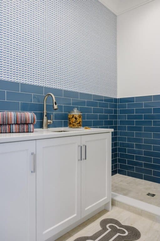 More than beds and bowls, homeowners are often turning to wash stations in a mudroom or separate space rather than scrubbing the family pet in the bathtub. When designing a wash station, consider the size of your pet and whether you want a high wash space so you arenโt bending over too much for a small dog, or a low and wide one to accommodate a large dog. When Fiona Leonard, principal designer at Fiona Leonard Interiors in Darien, CT, was called to design a mudroom with a dog-wash space for her New Canaan, CT clientsโ large rescue dogs, she kept the design simple and focused on functionality. โWe carved out a space in the mudroom for all items dog relatedโdog wash, dog food, dog care,โ says Leonard. โThis way dogs come in from their adventures and can be cleaned straight away.โ She chose custom cabinetry by Sterling Custom Cabinetry in Bridgeport, CT, white quartz counters from Academy Marble in Rye, NY, and a glass wall tile from Tile America. Then she paired everything with a tiny dog print wallpaper in navy and white from Thibaut Baxter. โFunction is important, but so is how the space makes you feel,โ adds Leonard. โWalking into a happy utilitarian space makes work fun, even if itโs messy.โ