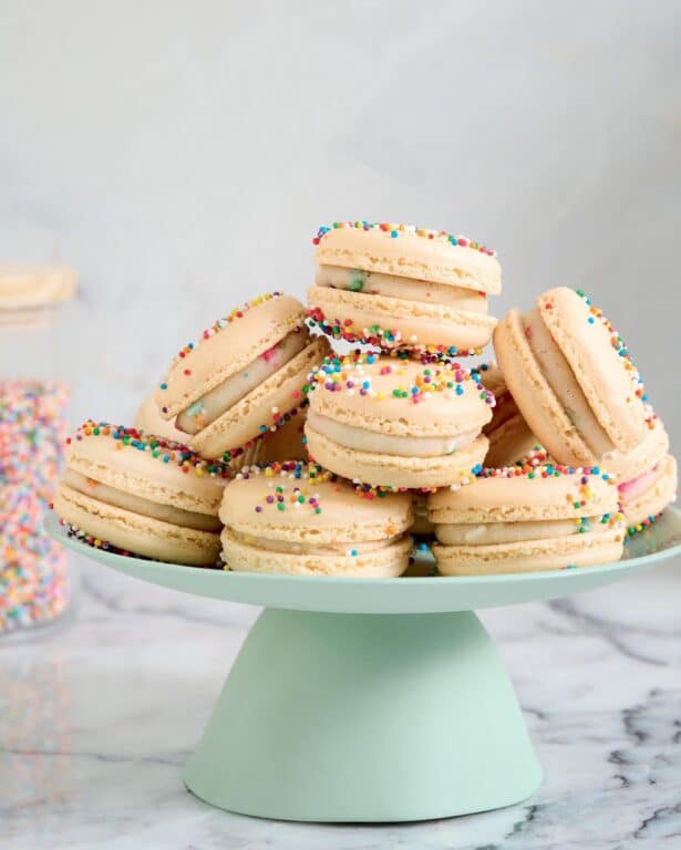 My first cookbook, Dana’s Bakery, had a whole chapter of cake batter– flavored goodies. The Cake Batter Truffle was so popular that we ended up using it as a filling for a limited run of cake batter macarons. We don’t have them available year- round, so I knew I needed to share the recipe here. Microwaving the flour ensures any harmful bacteria is killed, making it safe to use for the edible cake batter macaron filling.
