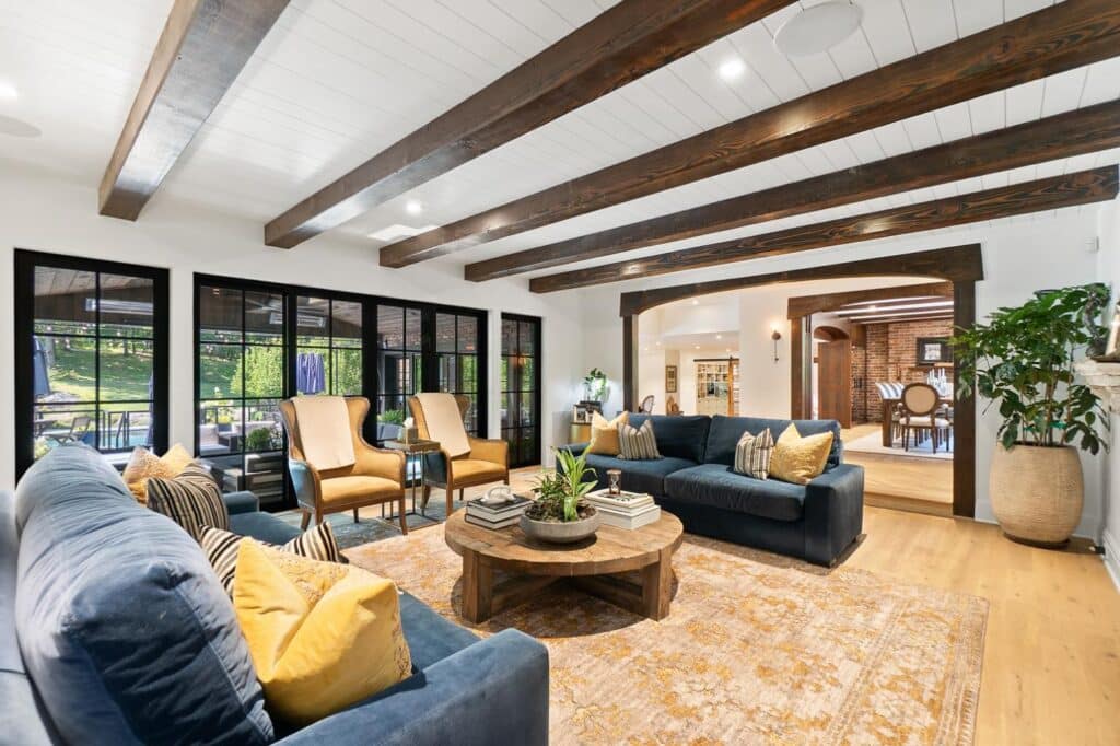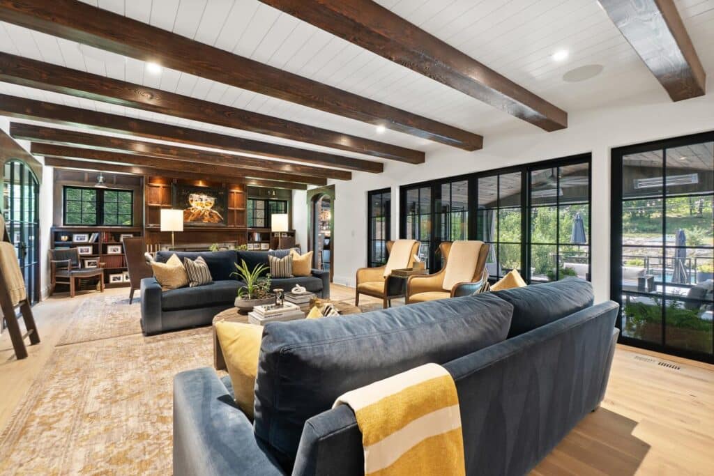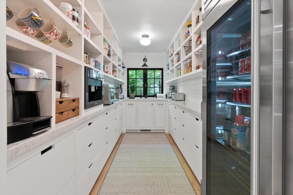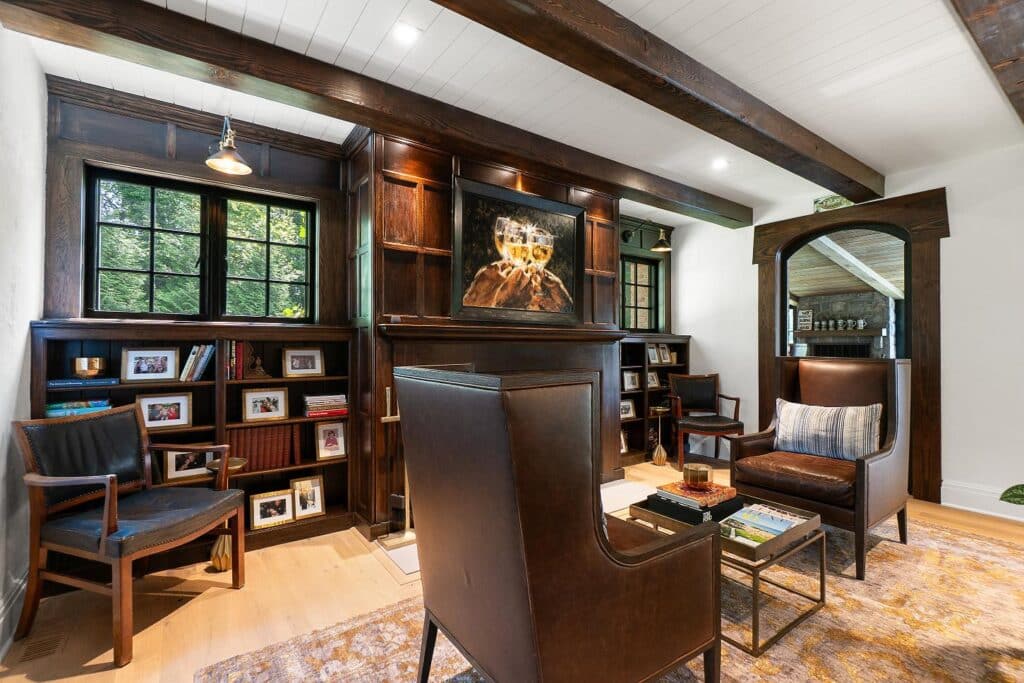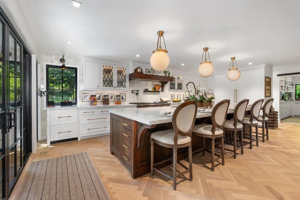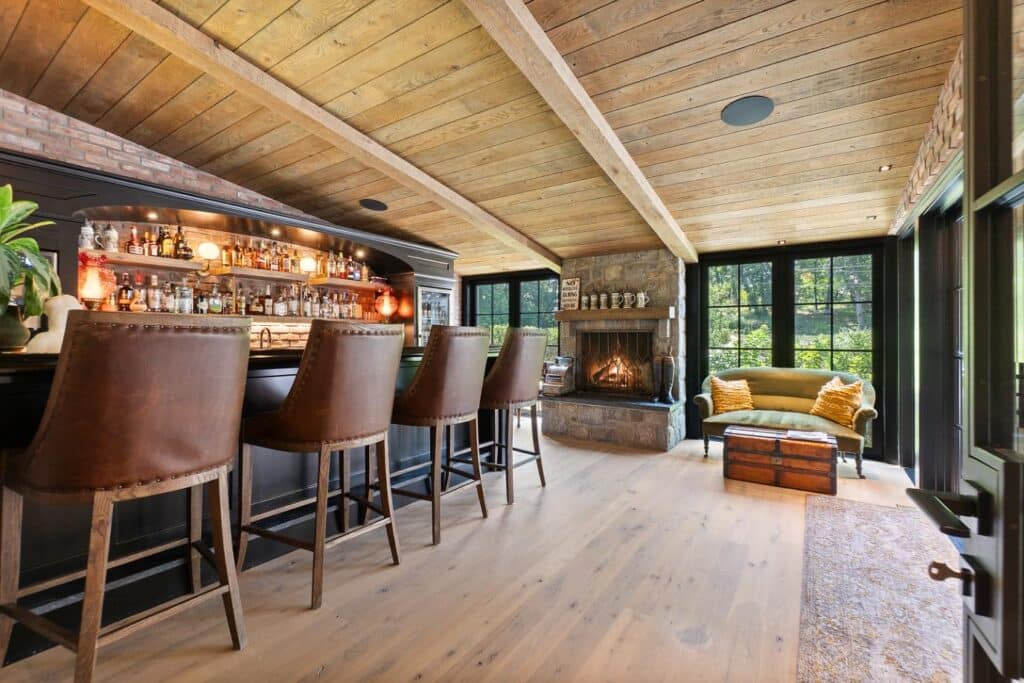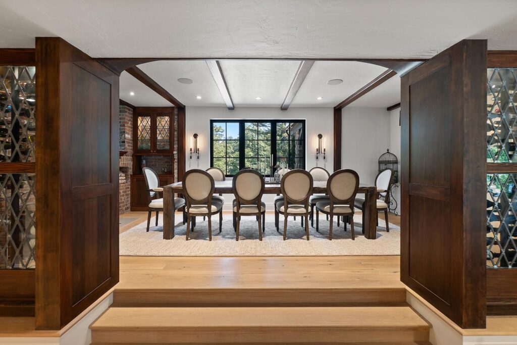 Coming through the arched wooden door, guests are greeted with herringbone floors, and an open-concept living room, dining room and gourmet kitchen. Bright white cabinets, a rich wood-paneled island with marble top, gold hardware and black paneled sliding glass doors to the patio give the kitchen a modern feel, but blend with the homeโs historic touches. Top-of-the-line appliances include a 60-inch Wolf range, Sub-Zero refrigerator and two Miele dishwashers, while just off the kitchen, a scullery has a built-in Miele espresso system and True beverage refrigerator. Leaded windows accent the cabinets and complement the wine storage in the dining room, which can be seen from both rooms. Brick accents, wide arched doorways and beamed ceilings can be found throughout the main floor. A lounge room has a full-sized bar and cozy stone-surround fireplace. โThe bar is spectacularโcozy, moody and well-equipped for a party,โ says Koorbusch. โYou feel like you are at a boutique hotel.โ