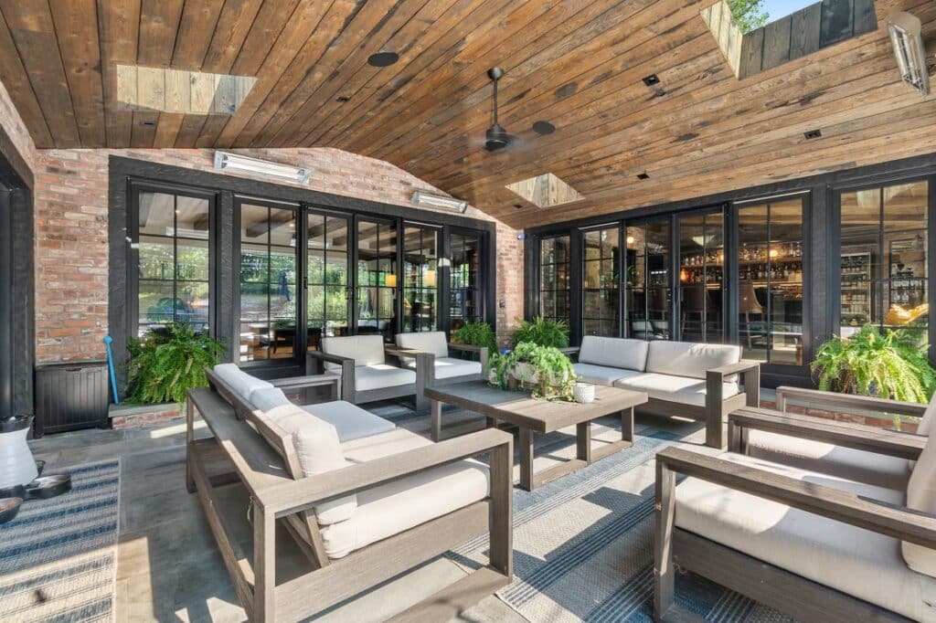 Sliding doors lead to the patio with brick exterior and a wood-beamed ceiling framing the space. The expansive patio has an outdoor kitchen, space for dining and lounging, and an outdoor fireplace. A few steps lead down to the in-ground heated saltwater pool and landscaped grounds. โI love the beautiful outdoor living spaces, including the heated covered terrace, outdoor fireplace, saltwater pool and the most charming side flower and vegetable garden surrounding a water fountain,โ says Koorbusch.