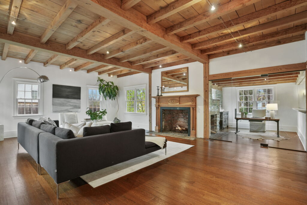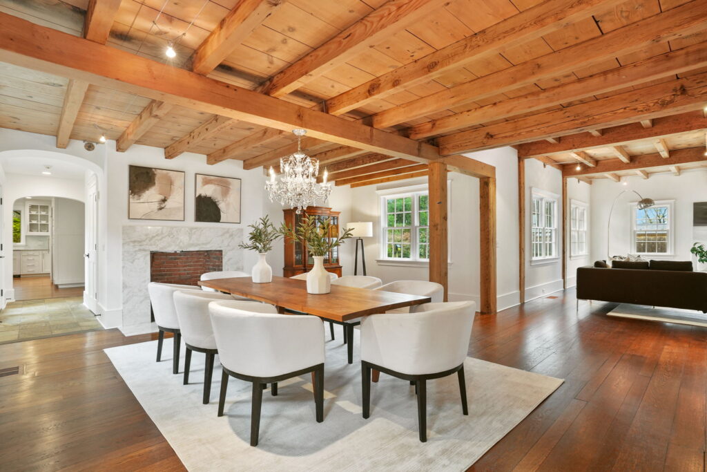 The charming gabled front and antique stonework of this more-than-6,000-square-foot Dutch colonial in Westport, CTโs Compo Beach neighborhood exudes old-world charm. Then you enter the front foyer to beamed ceilings, wide-plank wood floors throughout and four preserved fireplaces, which carry the homeโs country charms indoors. But the interiors of this century-old home have been reimagined for todayโs lifestyle. Just off the front entry sits the homeโs a glass-enclosed office with stone fireplace. Bright white walls, modern fixtures and lighting, an updated chefโs kitchen with top appliances and spacious family room provide contemporary comforts and design. โItโs historic, warm and inviting,โ says Dee Cohen, co-listing agent for the property from M&D Team at Compass in Westport along with Elayne Landau from Compo Point Properties. โThe home has been beautifully restored and expanded, changing the layout to support the modern homeownerโs lifestyle with dramatic entertaining spaces and separate casual family spaces rather than a single-room floor plan,โ adds Cohen.