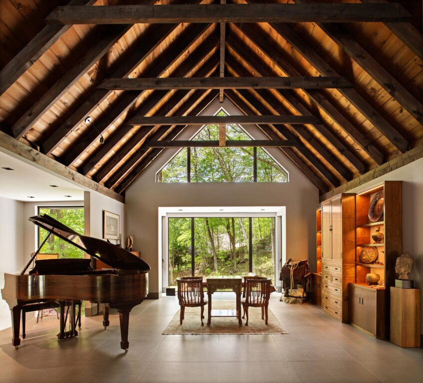 The current homeowner was drawn to the 1980 Japanese-inspired single-family home because of its bucolic Pound Ridge, NY, setting and soaring wood-beamed cathedral ceiling. Each window in the home was designed to take in tree-filled views of the surrounding landscape. Interiors were taken down to the studs during the renovation, and each detail was chosen to accentuate the homeโs biophilic design. For the radiant heat tile floors, Marcogliese helped the owner hand-select the Italian made ceramic tiles from Florim. Then, they replaced the two-story fireplace surround with marble selected at BAS stone in Long Island City and installed by Fordam Marble in Stamford, CT, which happened to reveal a buddha silhouette when honed. โItโs just kind of fabulous that it happened in this kind of house,โ says Marcogliese. โShe just magically appeared.โ