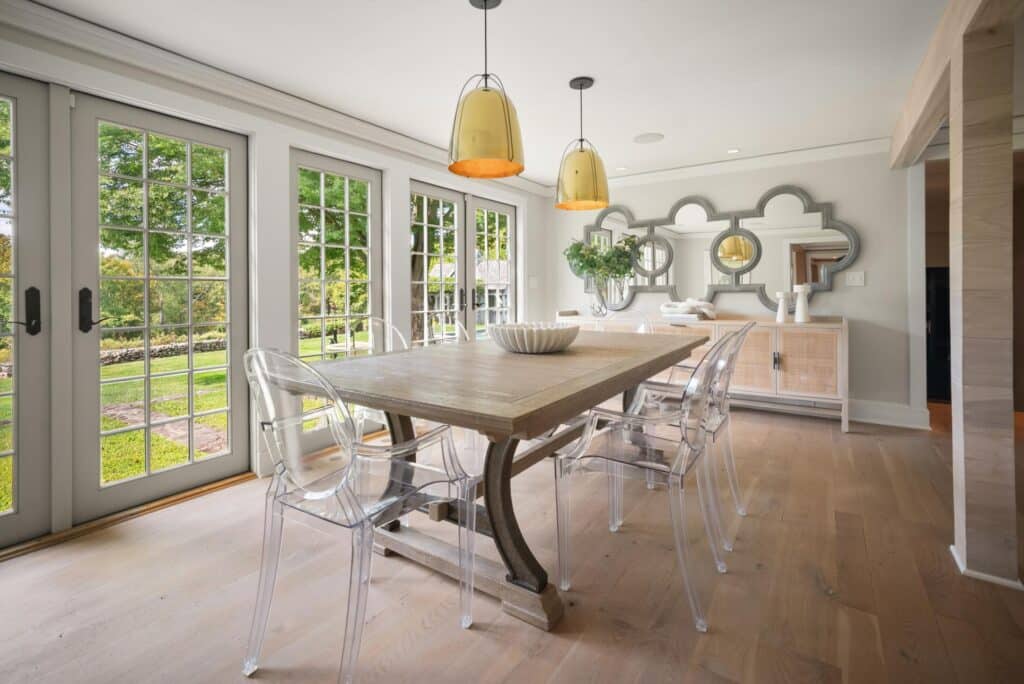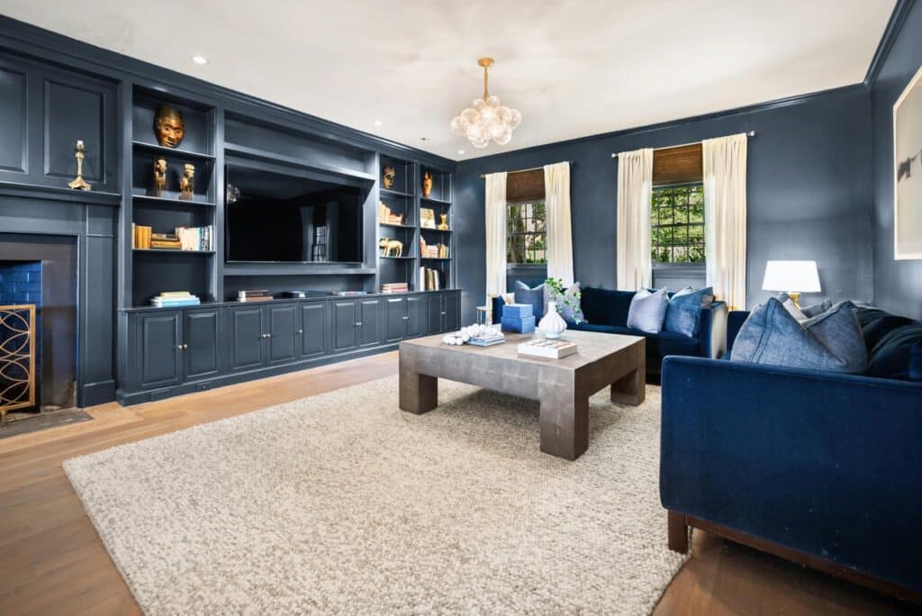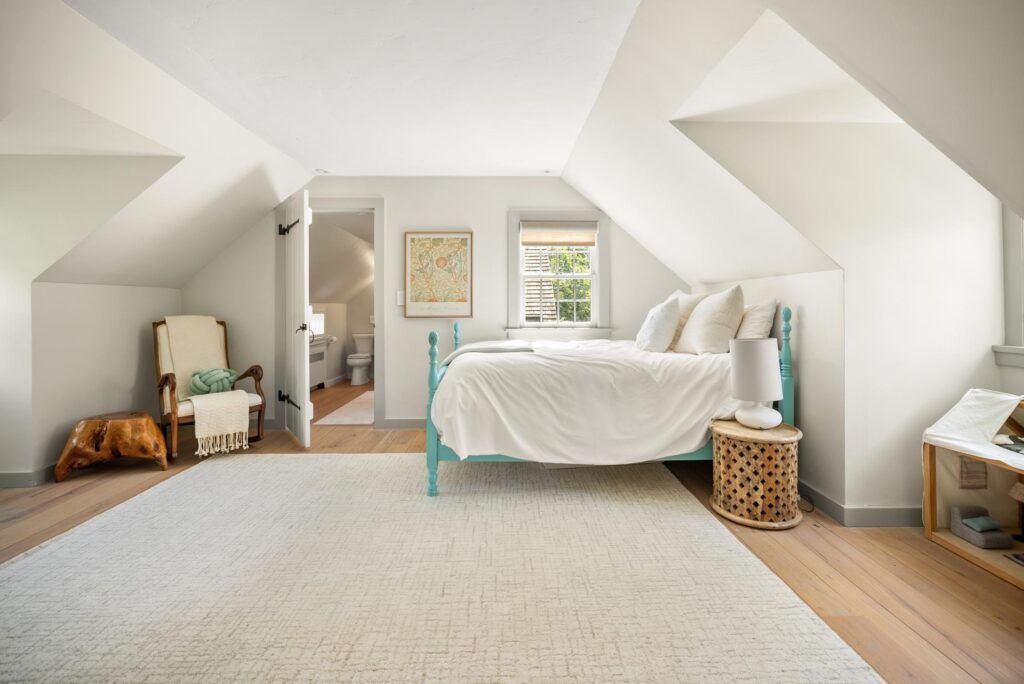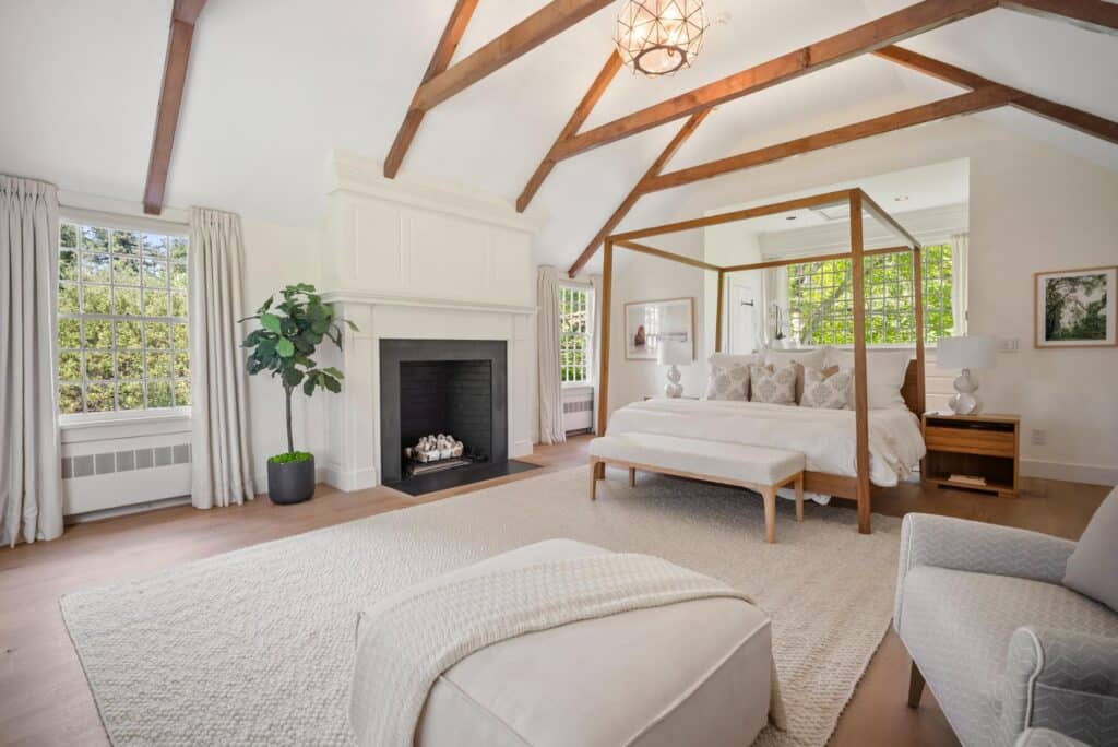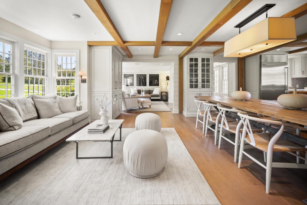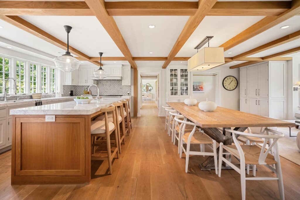 Thoughtful updates include a new custom kitchen with top-of-the-line appliances and new cabinetry, opening the living room and dining room to create better flow, all new renovated bathrooms with custom tile work, and a thorough renovation to the barn to create a recreation space with kitchen, bath, lounge and simulation golf. Windows and lighting throughout the main house and barn are new and smart home automation was added, including Savant controls and commercial-grade WiFi. โWhat makes the home especially unique is the balance of those modern upgrades with original character: wide-plank floors, reclaimed wood beams, and vintage elements that speak to the homeโs 1940s roots,โ says Raney.