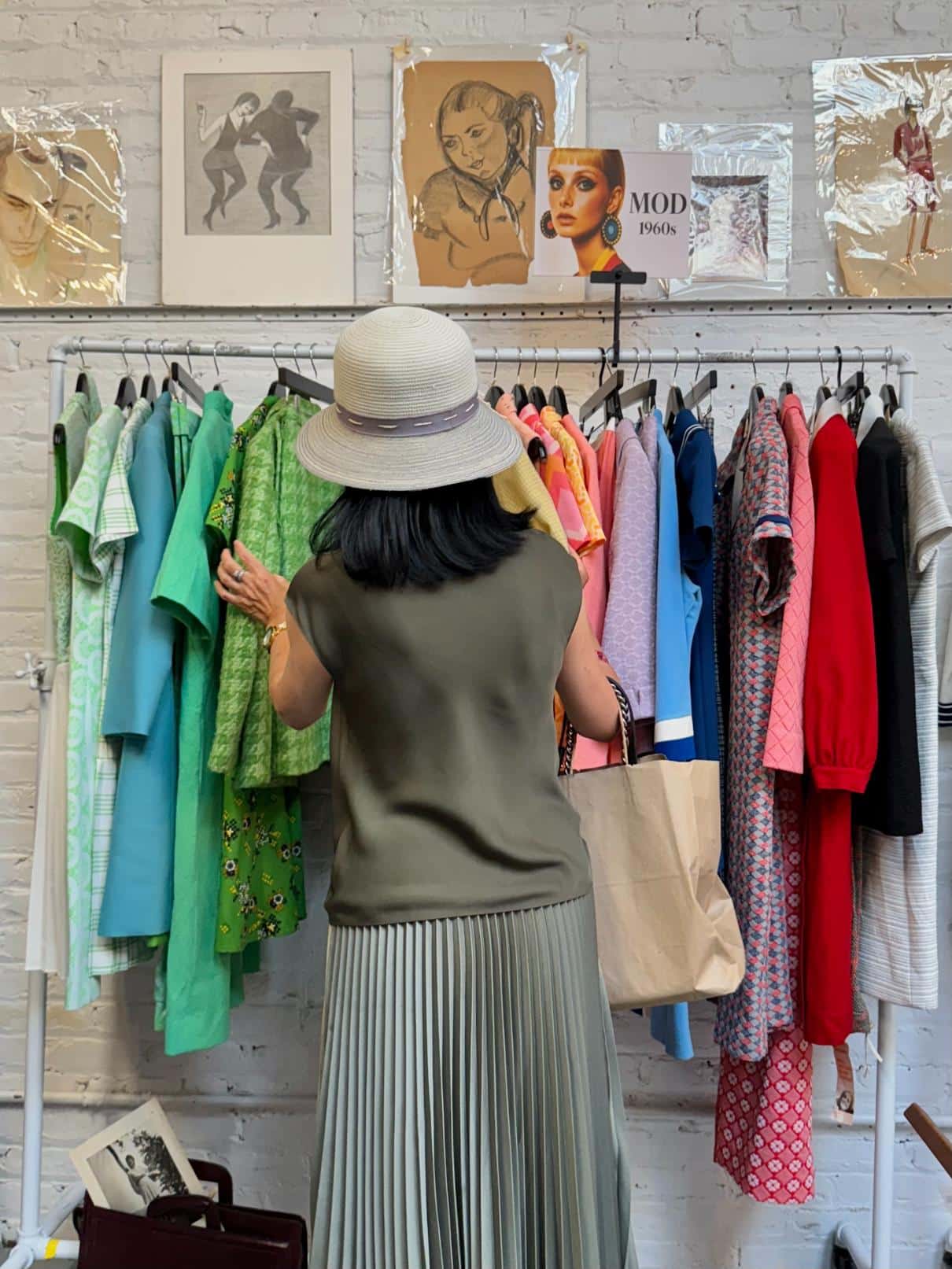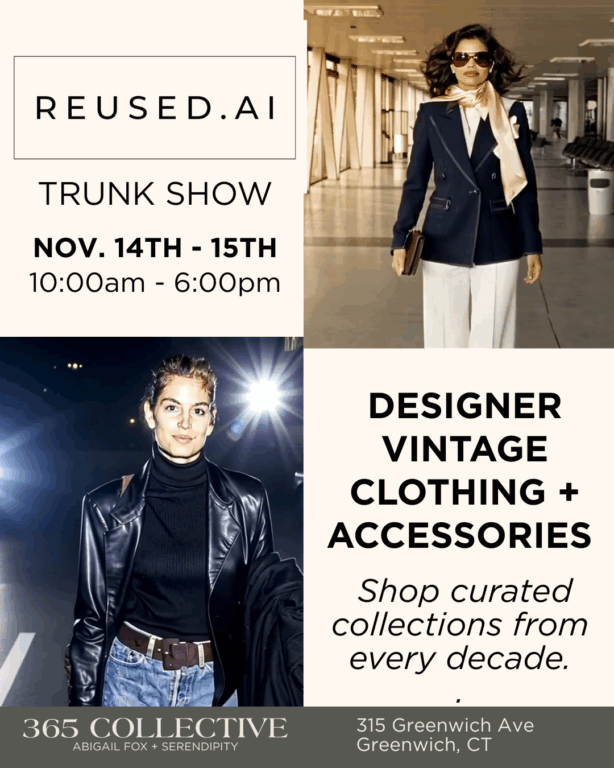 Reused works with local boutiques and venues doing pop ups in New York City and beyond. This Nov. 14 and 15, they will hold a vintage shopping pop-up at 365 Collective at 315 Greenwich Ave., Greenwich, CT. This will be the first time the brand will come to Greenwich and Ksenia has curated a special night for the occasion. “When we move between towns, we learn new preferences and bring new histories to new people,” she says.  “We design every pop-up carefully—from music to scent to how the pieces are arranged—so people can slow down, touch the fabrics and really experience the collection.” For the Greenwich pop up, expect to explore lots of pieces from Reused’s 1960s collection. “We’re so excited for this one,” says Ksenia. “The 60s were all about transformation, and we wanted to capture that energy.” For women, expect a mix of Mod and Hollywood Glam: structured mini dresses, cocktail pieces, sculptural coats and soft beaded shifts. For men, think “old money”: sharp tailoring, cashmere and transitional pieces for the holidays.